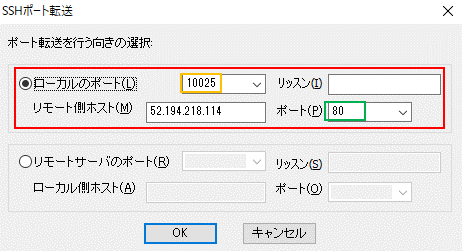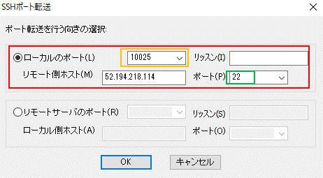 4.「ローカルのポート」は、ログインしたサーバのポート番号の未使用の値を入力します。