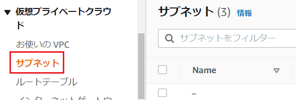 6.作成後、画面左の「サブネット」をクリックすると作成したサブネットが表示されます。