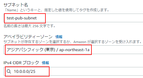 IPv4 CIDRブロックは、10.0.0.128/25を指定します。