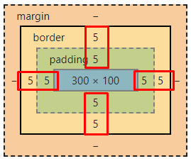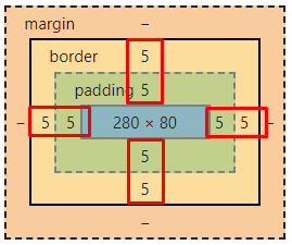 その周りにpaddingとborderで上下左右に5ずつ入っているので