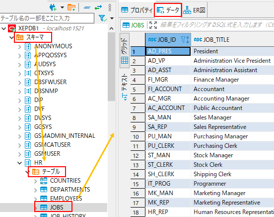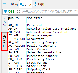 1.「スキーマ」>「テーブル」から参照したテーブルをダブルクリックすると右側の「データ」タブにデータの一覧が表示されます。※表示にグリッドを選択しています。