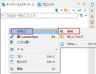 1.データベースナビゲータの空白の箇所で「作成」→「接続」をクリックします。