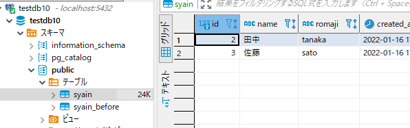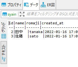 1.「スキーマ」>「テーブル」から参照したテーブルをダブルクリックすると右側の「データ」タブにデータの一覧が表示されます。※表示にグリッドを選択しています。