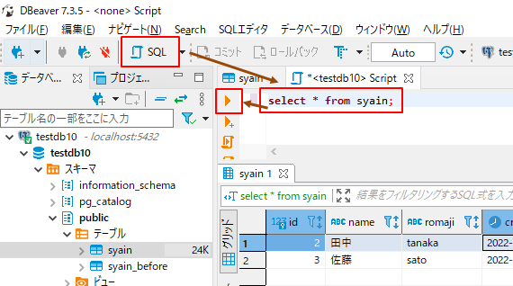 DBeaverでPostgreSQLに接続してSQLを実行するサンプルです。