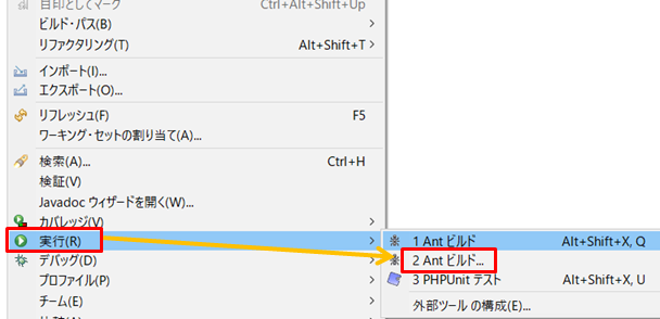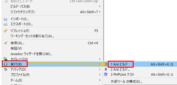 1.build.xmlを右クリックし「実行」→「1 Antビルド」をクリックします。