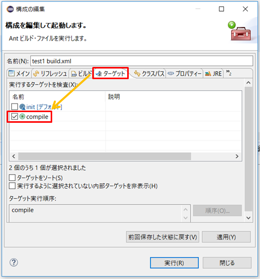 3.「ターゲット」を選択し「compile」にチェックを入れて実行を押すとjavacコマンドが実行されます。compileという名称は、build.xmlの10行目のnameの値です。