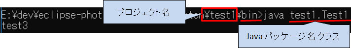 ポイントは、1.javaコマンドの引数にパッケージ名(test1)を指定した後にクラス名(Test1)を指定します。
