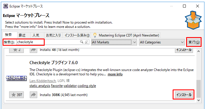 2.「検索」の入力欄にcheckstyleと入力して「実行」ボタンを押して検索します。