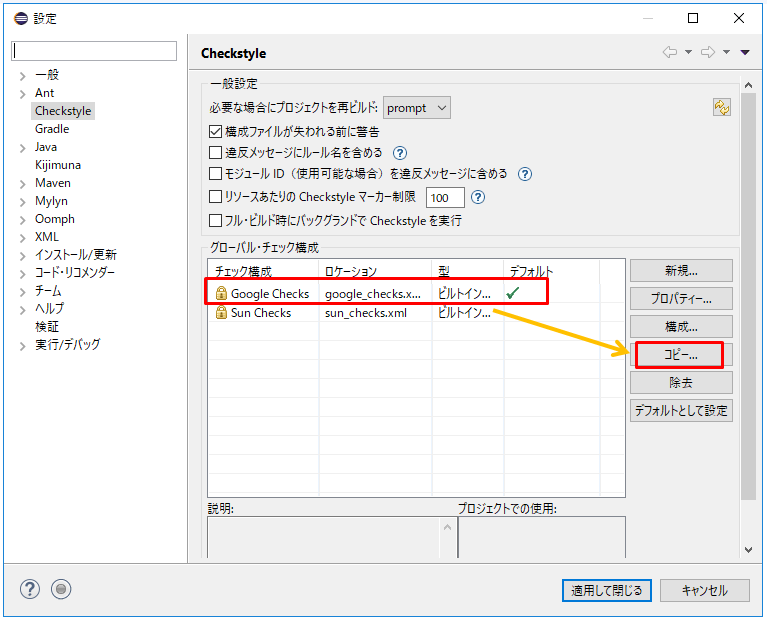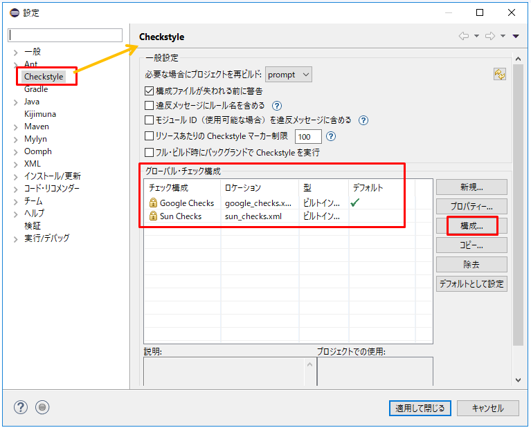 - Checkstyleをアクティブにする