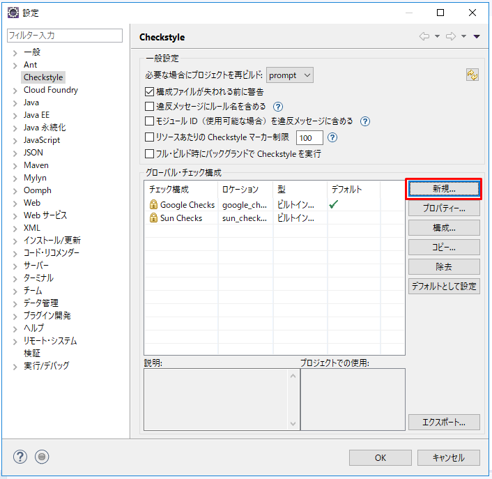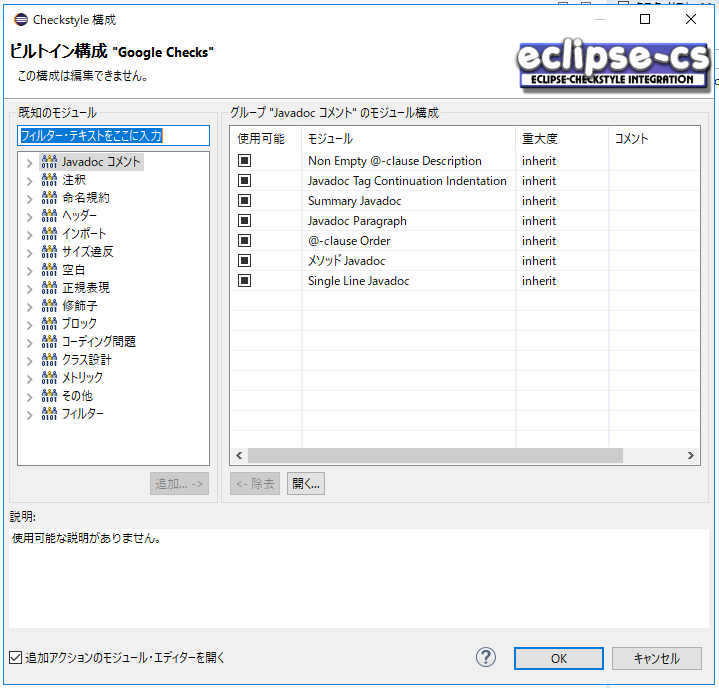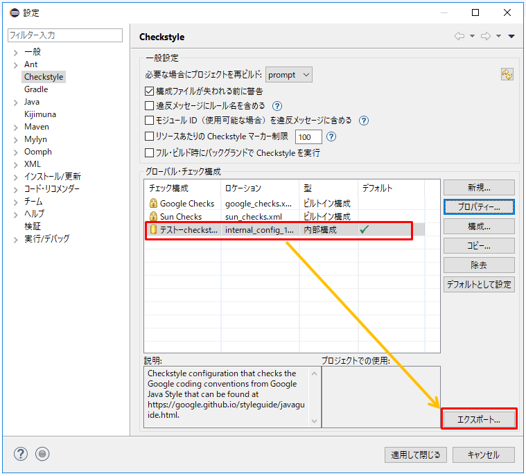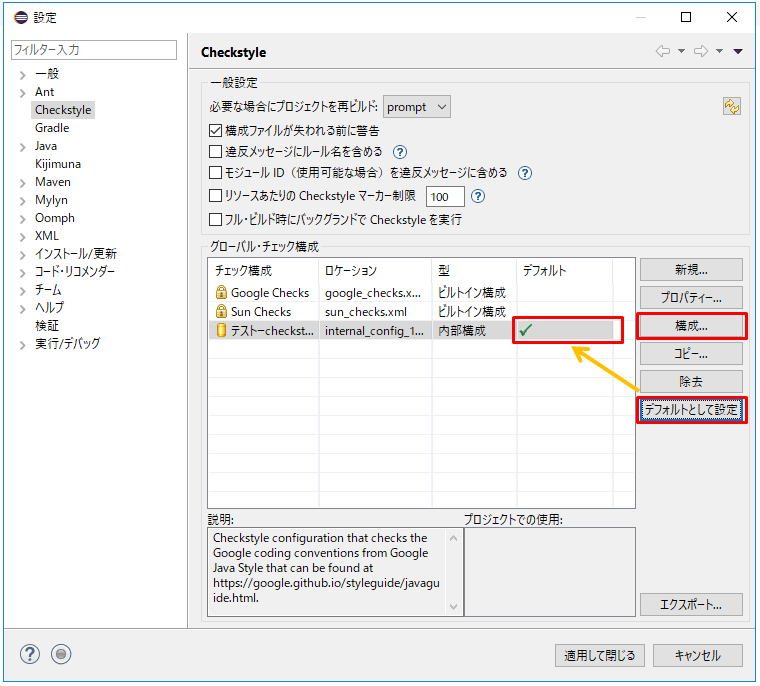 3.Checkstyle構成の画面です。現在適用されているチェック内容を確認できます。