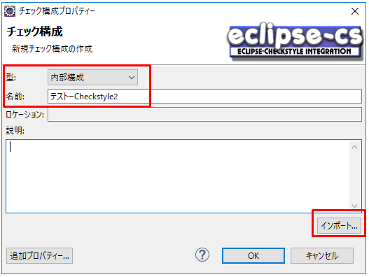 2.「型」は内部構成にして任意の名前を入力し、「インポート」ボタンを押します。