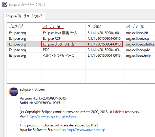 3.「フィーチャー名」の列の「Eclipseプラットフォーム」の行にバージョンが記されています。