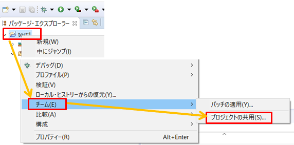 1.プロジェクトを右クリックして「チーム」→「プロジェクトの共用」をクリックします。