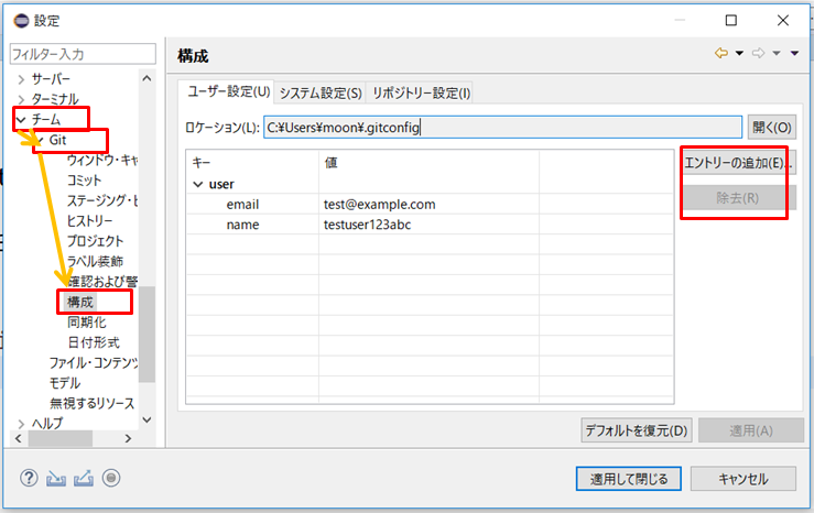 追加は「エントリーの追加」で、削除は「除去」をクリックします。
