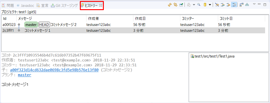 2.ヒストリータグにコミットした結果が表示されます。