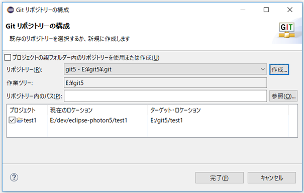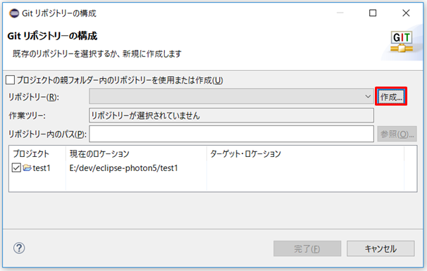 4.以下はリポジトリの場所の指定が完了した図です。完了ボタンを押すと作成されます。