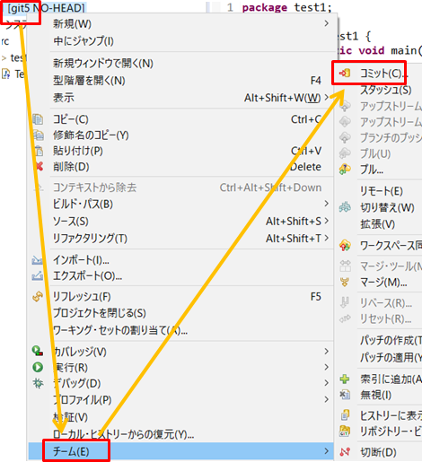 1.プロジェクトを右クリックして「チーム」→「コミット」をクリックします。