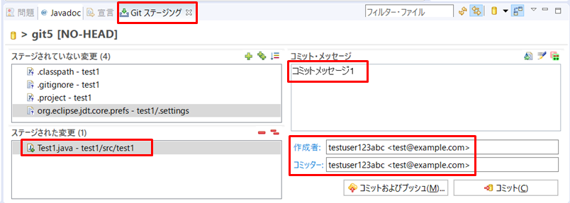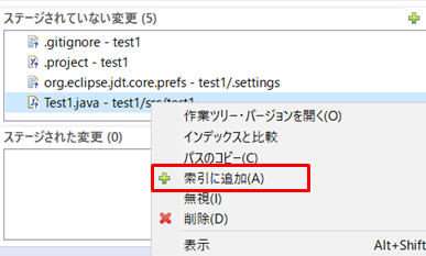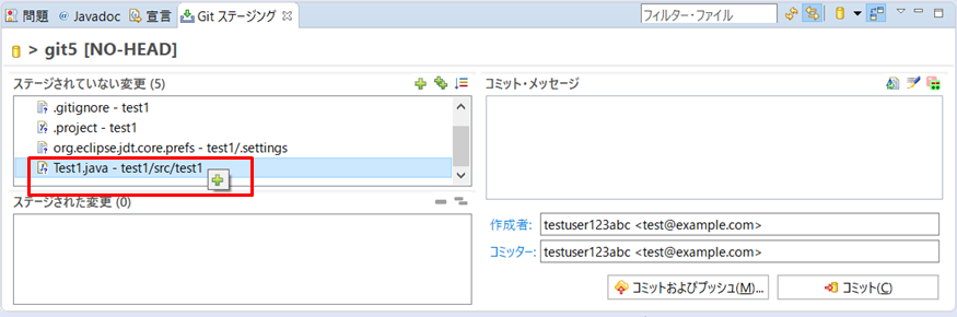 4.以下の図は、コミットの対象を「ステージされた変更」に移した状態です。