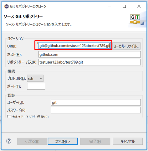 3.URIにGitHubでコピーしたSSH接続用のURLを貼り付けます。