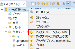 2.アップストリームへプッシュを選択するとGitHubにpushで反映されます。