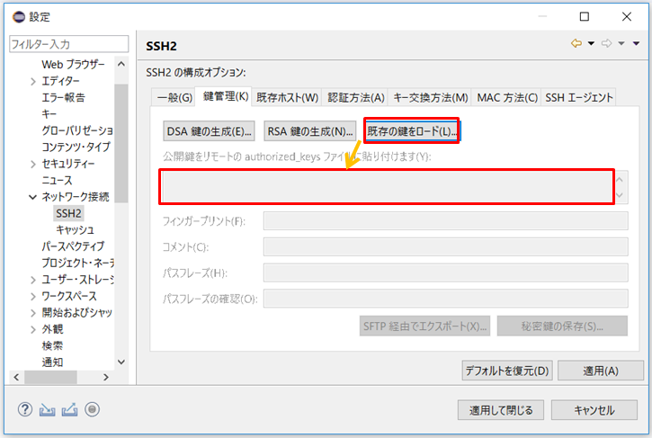 4.EclipseのSSHのダイアログで「既存の鍵をロード」をクリックすると鍵を選択するダイアログが表示されます。