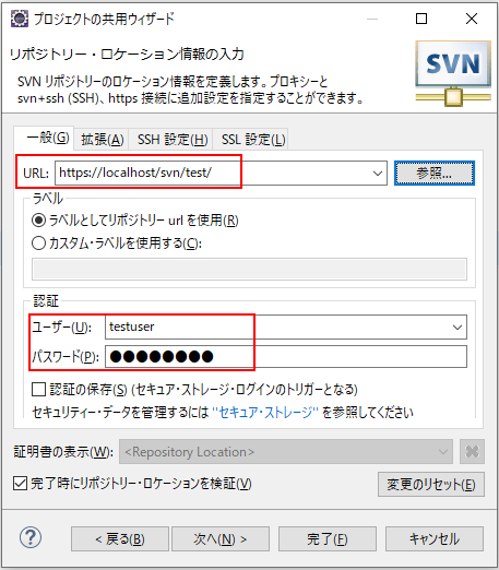 3.SVNのURL、ユーザー、パスワードを入力し次へボタンを押します。