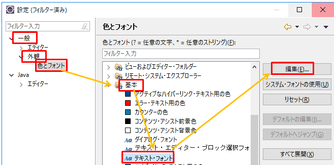 3.「一般」→「外観」→「色とフォント」→「基本」→「テキスト・フォント」→「編集」をクリックします。pom.xmlのxmlファイルのフォントも変わります。