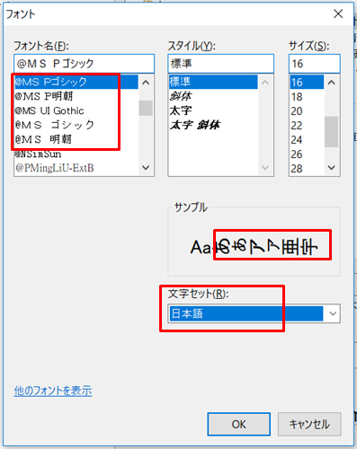 下の方にある「文字セット」を日本語にすると「サンプル」に日本語が表示され、文字の表示を確認できます。
