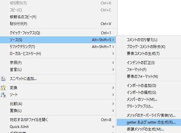 1.ソースコード上で、右クリックして、「ソース」→「getterおよびsetterの生成」をクリックします。