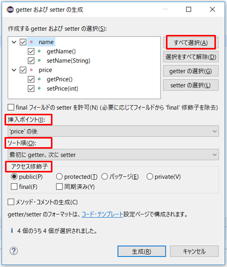 ・「ソート順」は「最初にgetter,次にsetter」を選びました