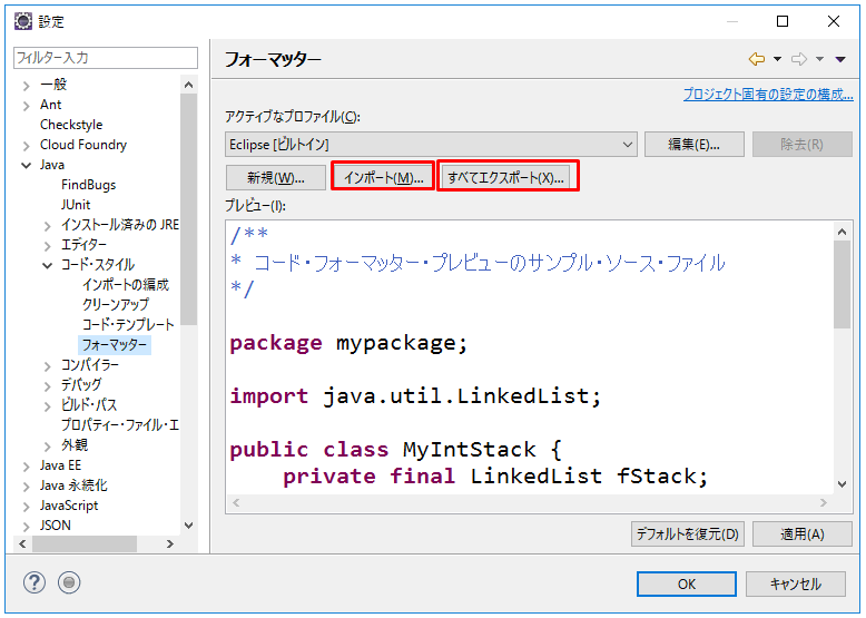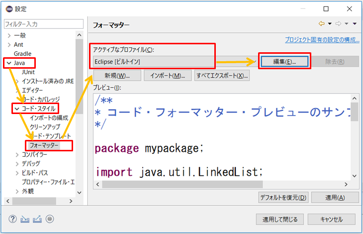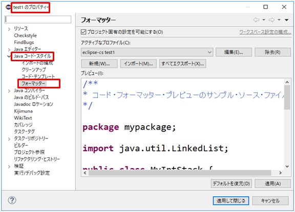 2.プロジェクトのプロパティを表示し、「Javaコード・スタイル」→「フォーマッター」をクリックし、設定は想定どいりになっているか確認します。