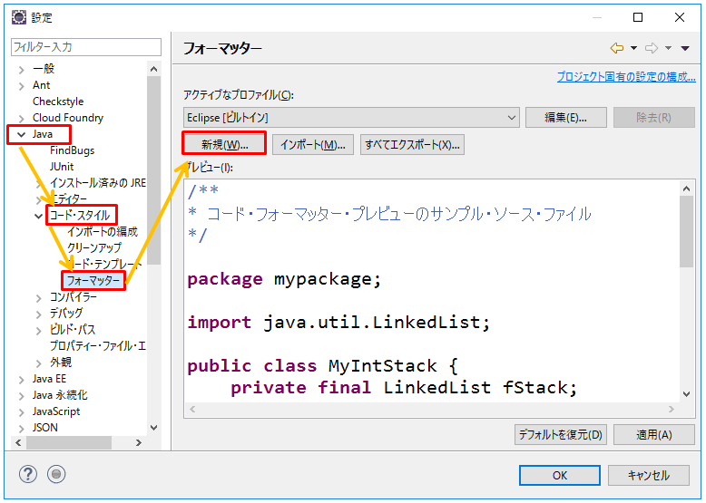 2.「Java」→「コード・スタイル」→「フォーマッター」→「新規」をクリックします。