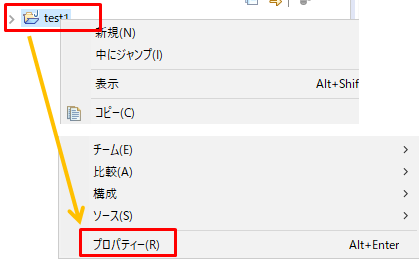 1.プロジェクトを右クリックし「プロパティ」をクリックします。