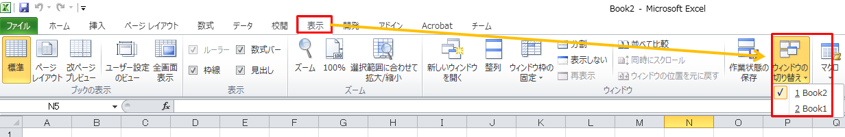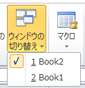 以下のように「表示」→「ウィンドウの切り替え」をクリックし、Book2とBook1というように複数のブックが開いている場合です。