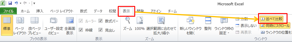 1.「表示」→「並べて比較」をクリックします。「同時にスクロール」も押下状態になります。