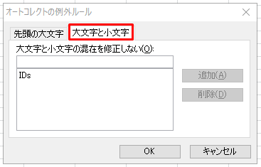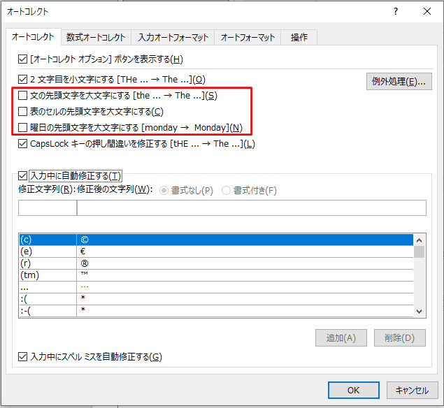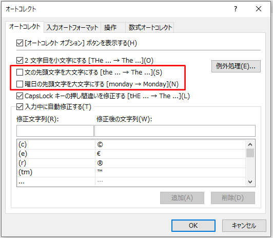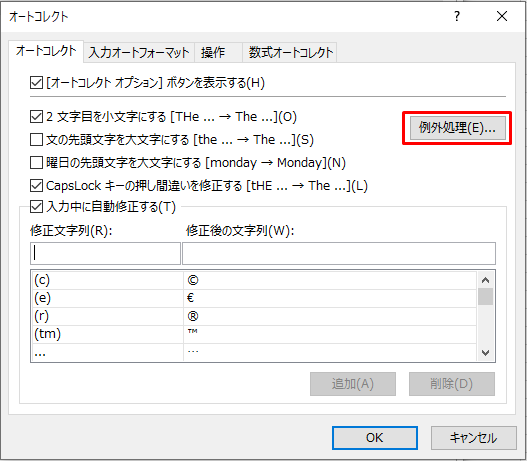 (補足)「例外処理」をクリックするとオートコレクトの例外を設定をすることができます。