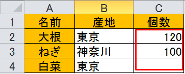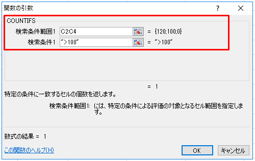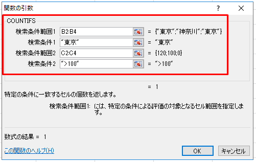 | =COUNTIFS(B2:B4,"東京",C2:C4,">100") |