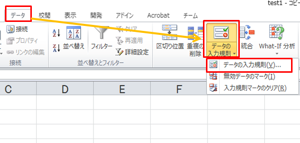 2.「データ」>「データの入力規則」>「データの入力規則」をクリックします。