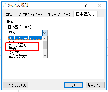データの入力規則のIME日本語入力の設定では、「オフ(英語モード)」と「無効」があります。