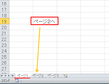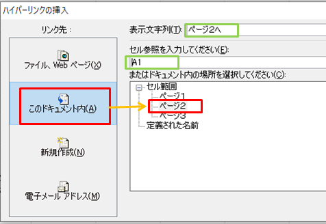 例:「ページ1」にあるリンクをクリックして「ページ2」の特定のセルに遷移する。