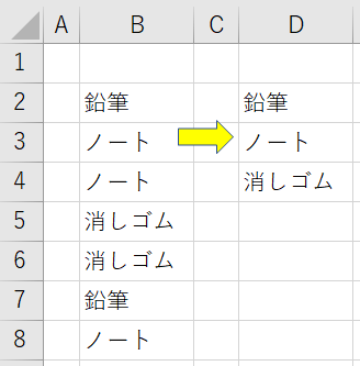 B列に値が並んでいる状態からD列に一意の値のみ抽出します。