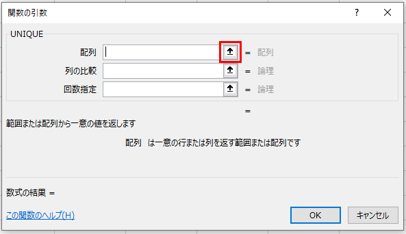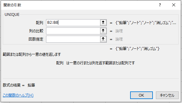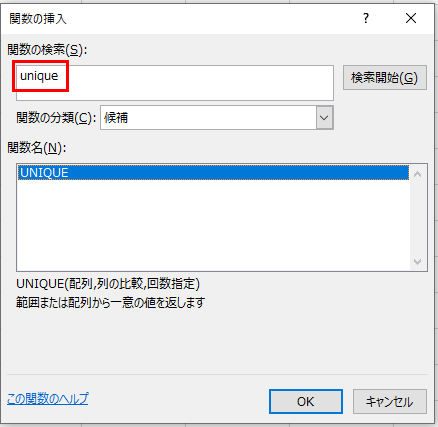 「関数名」にUNIQUEが表示されるので選択してOKボタンを押します。