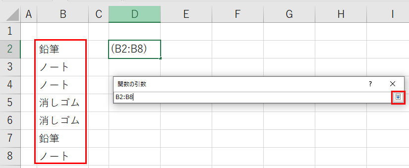入力完了後は「関数の引数」の右端のアイコンをクリック、