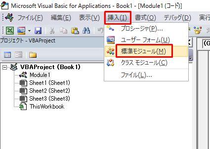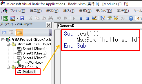 2.標準モジュールのModule1を選択し、コードウィンドウにコードを記述します。