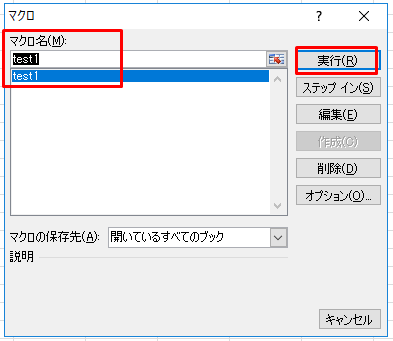 5.マクロ名にあるtest1を選択し、実行を押します。