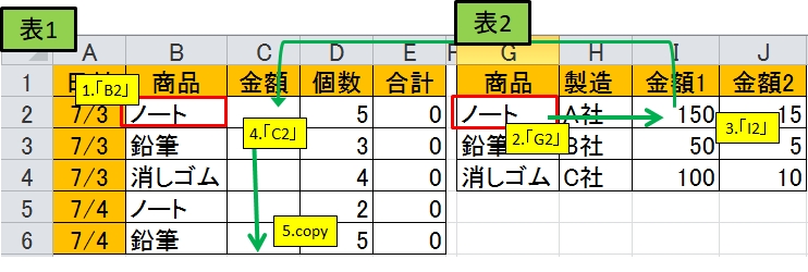 2.C2からC6まで下に数式のコピーを行うと、表2の「ノート」、「鉛筆」、「消しゴム」の商品ごとの金額が表1の商品にあわせてC列にセットされます。