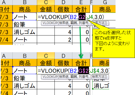 - 数式のG2にカーソルを当ててF4キーを押し、G$2(行固定)とします。(下図参照)