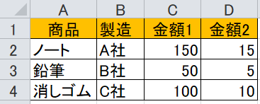 表2は、商品ごとに金額がある表です。マスターデータのイメージです。