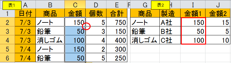表2の「ノート」、「鉛筆」、「消しゴム」の商品ごとの金額1が、表1の商品にあわせてC列の金額にセットされます。