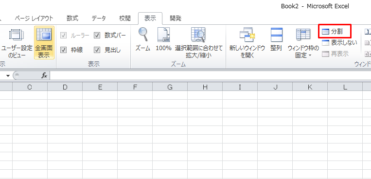 3.表示タブにある「分割」をクリックします。